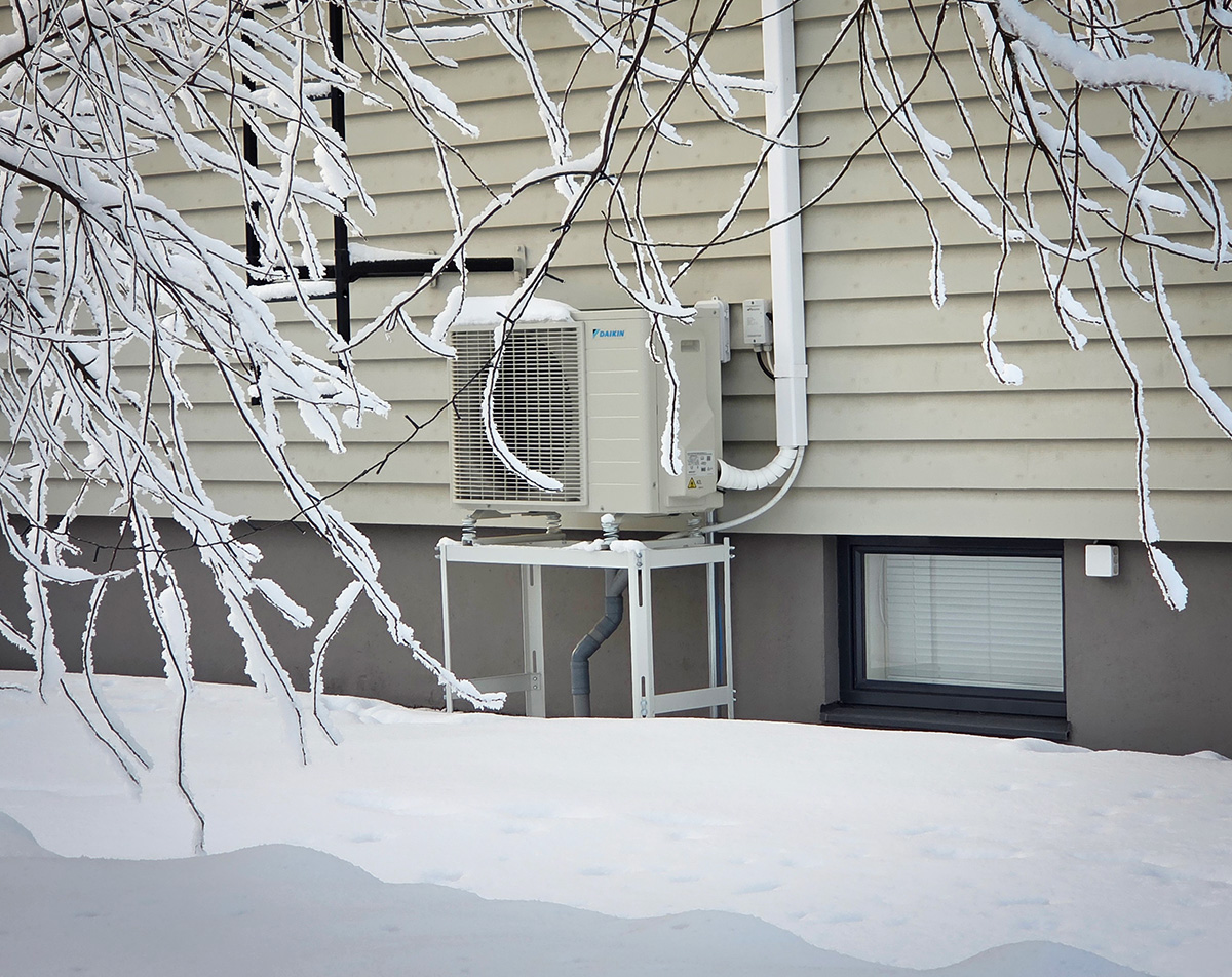 Myös viemäröinnin lämmityskaapelia ohjaa sama lämpöpumpun äly, joka huolehtii myös sään ja tarpeen mukaisesti sulatusjaksojen ajoituksesta sekä pohjalevyn sulanapitovastuksen toiminnasta. Tämä säästää pitkän lämmityskauden aikana merkittävästi energiaa, kun ulkoyksikön sulatukseen ja huurteen poistoon käytetään sähköä vain juuri sen verran kuin tarvitaan.