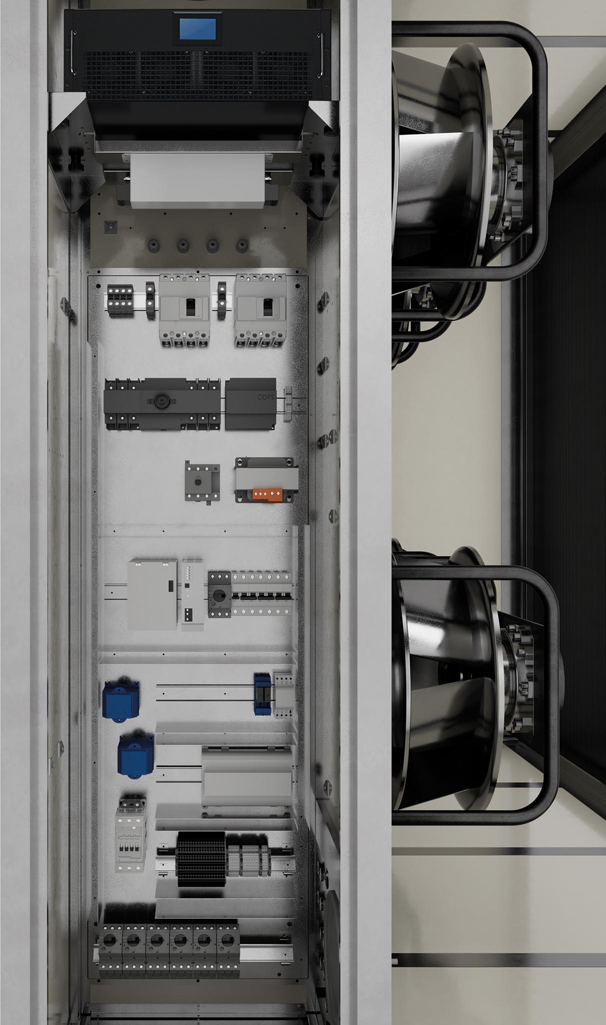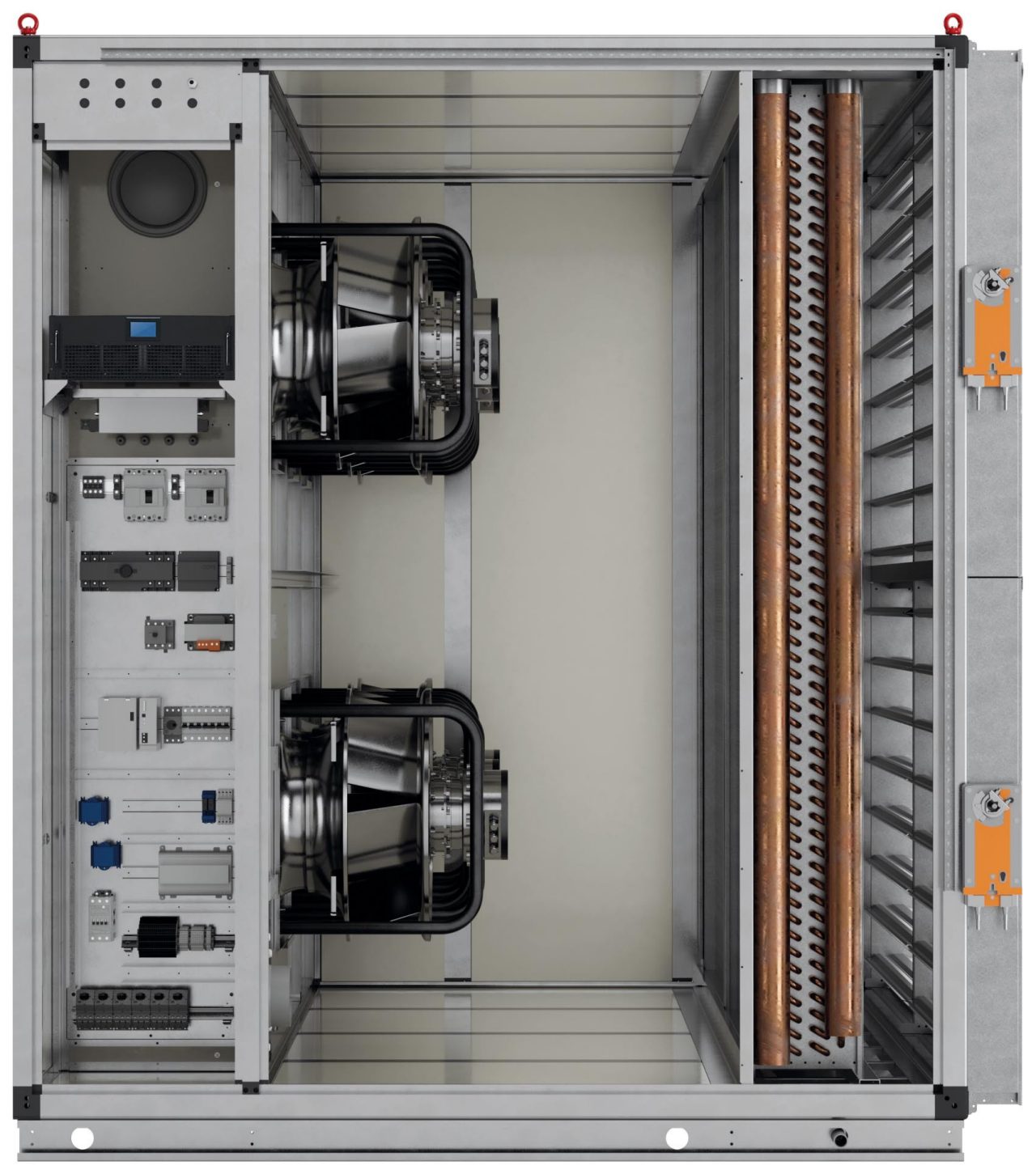 Ilmansuodattimet, ohjauskeskus, UPS, puhallinmatriisi, jäähdytyspatteri (jopa 8-rivinen) ja pellit integroidaan tarpeiden mukaan anodisoidusta alumiiniprofiilista valmistettuun kotelorakenteeseen, joka on asennettu kuumasinkitylle pohjakehikolle. Koko moduuli esitestataan ja toimitetaan käyttövalmiina.